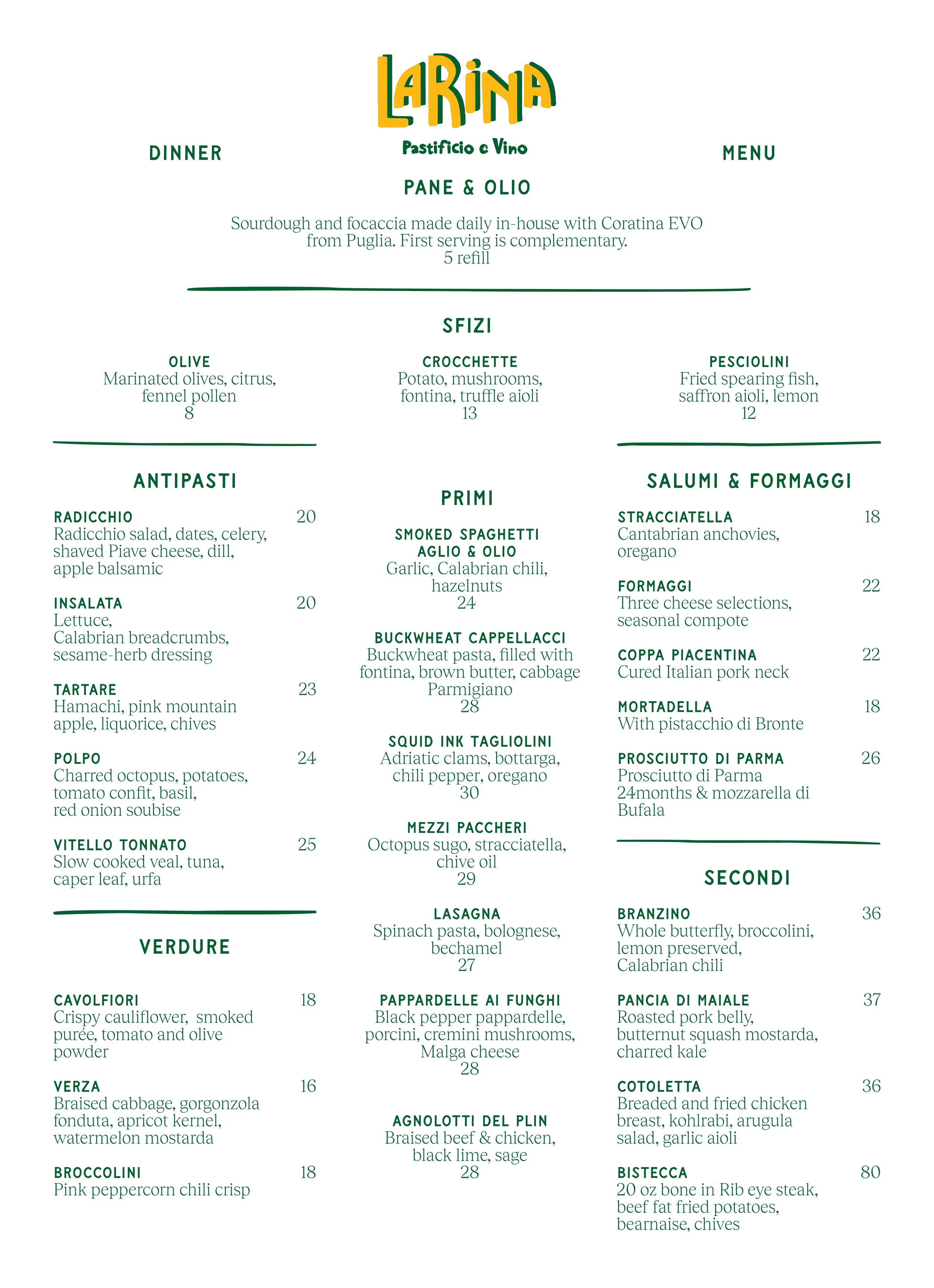Larina Pastificio & Vino, 387 Myrtle Avenue, Brooklyn, NY, 11205, United States7188520001larinabrooklyn@gmail.com